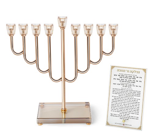 חנוכייה דגם מתכת עם תחתית זכוכית וקנים קריסטל צבע זהב קטנה
