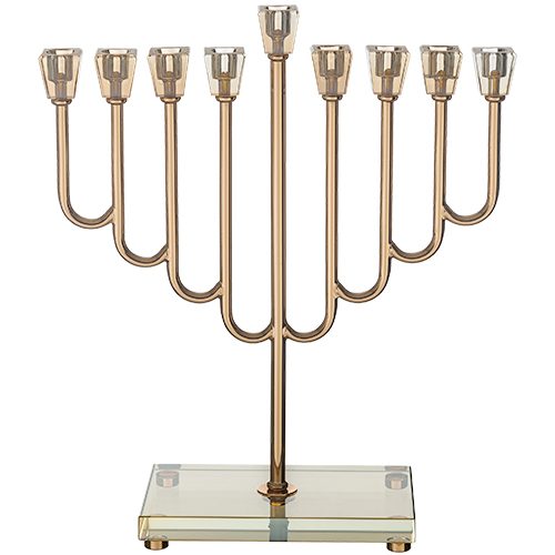 חנוכייה דגם מתכת עם תחתית זכוכית וקנים קריסטל צבע זהב