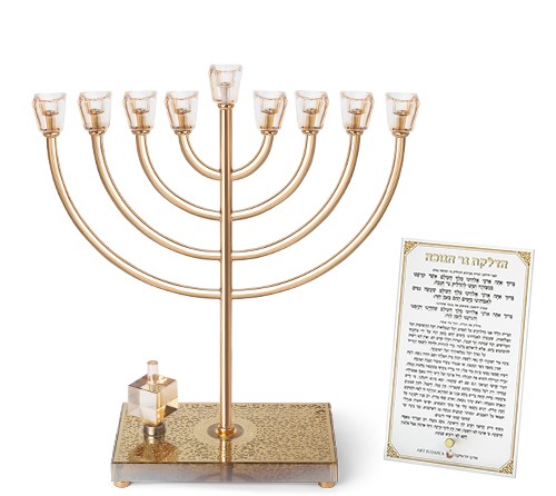 חנוכייה דגם מתכת עגולה בסיס פלקטה ראשי קריסטל וסביבון צבע זהב