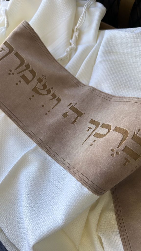 טלית מהודרת – עשויה מ- 100% צמר עם בד מונע החלקה עם עטרת ראש הניתנת להתאמה אישית לבחירת הלקוח ניתן להוסיף רקמת שם בפינות לבחירת הלקוח לדוגמאות נוספות ועיצוב אישי ניתן לפנות אלינו דרך כפתור Whatsapp