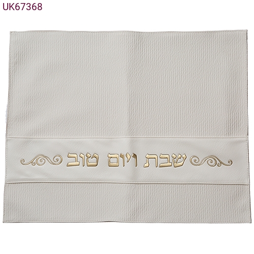 כיסוי חלה דמוי עור דגם עיטורים אותיות מובלטות שבת ויום טוב צבע לבן זהב