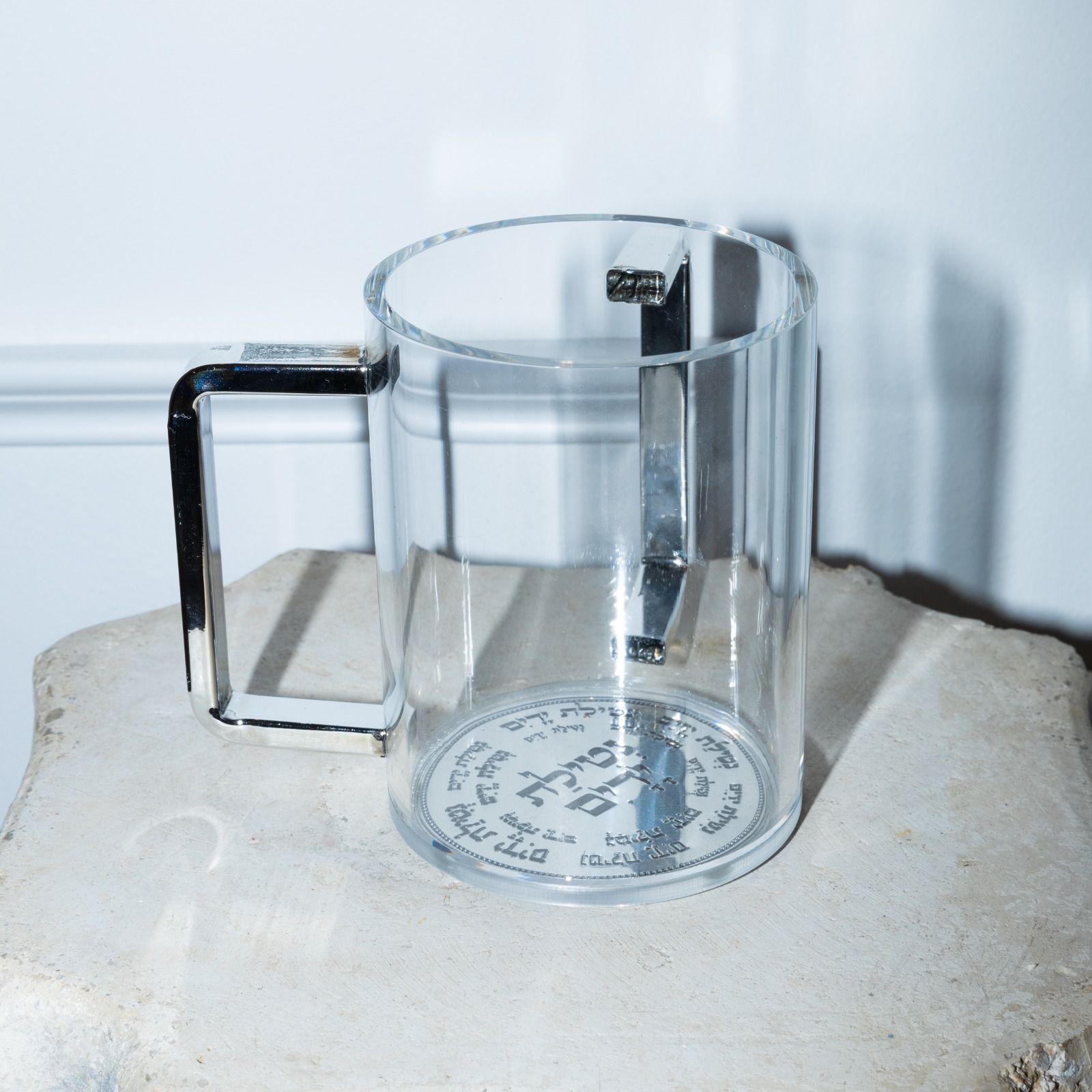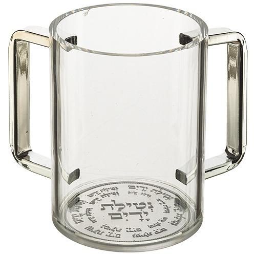 נטלה שקופה אקרילית עם ידיות בציפוי בצבע כסף יוקרתית משולבת פלקטה כסופה עם ברכה על נטילת ידיים
