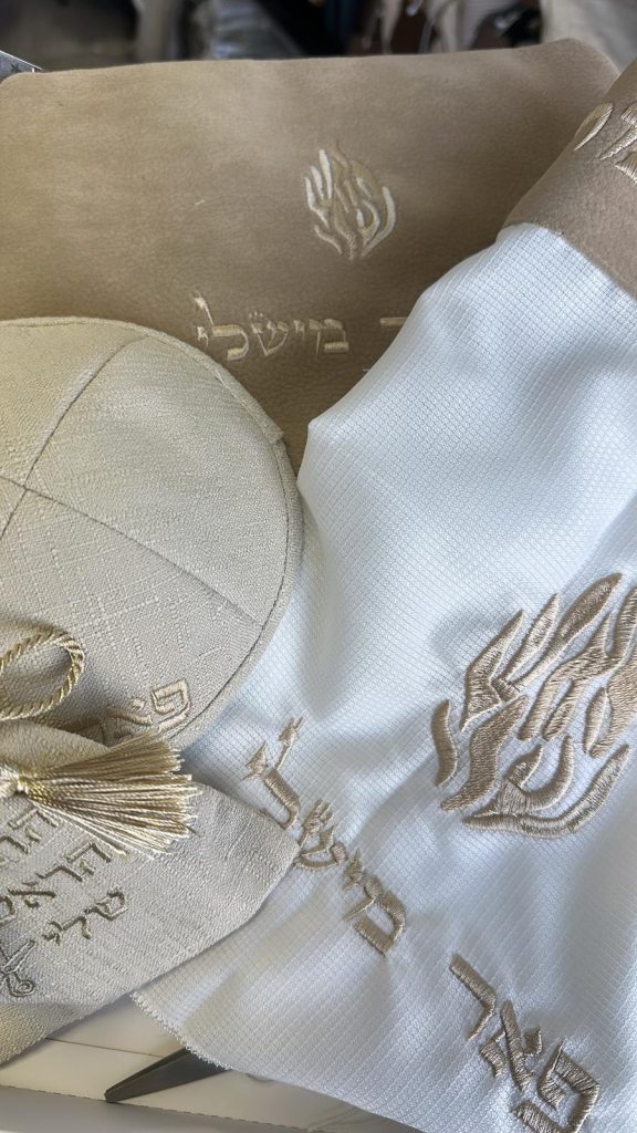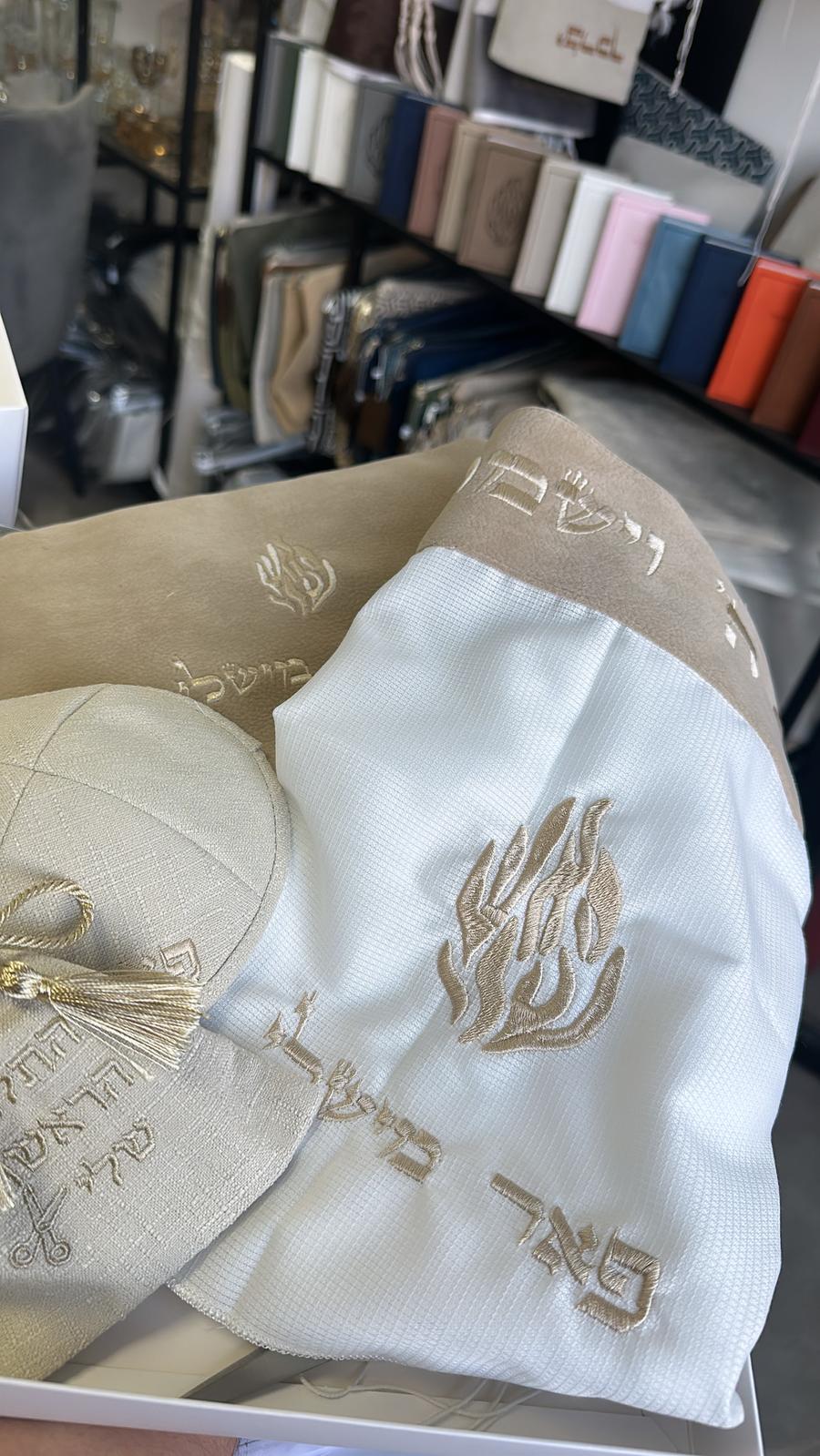 סט חלאקה הכולל בתוכו טלית עם פס בצוואר במגוון צבעים,כיסוי טלית ,כיפה ,תיק לתלתל, מספריים