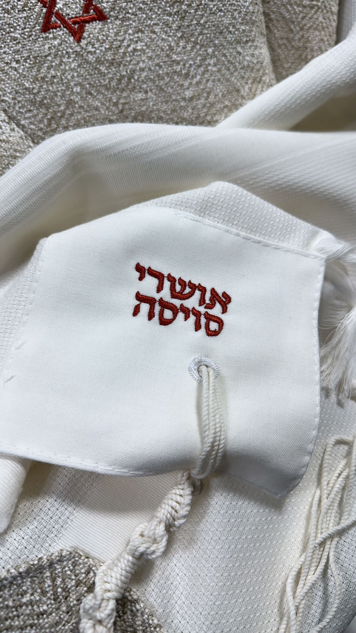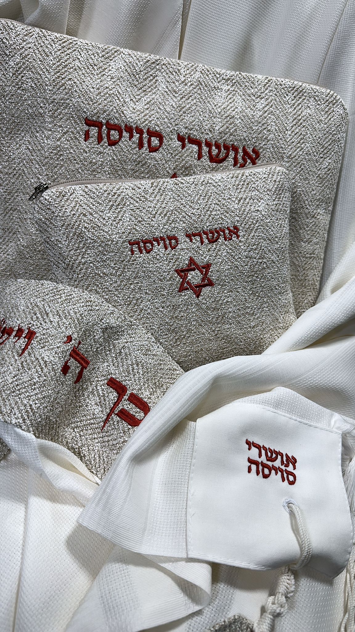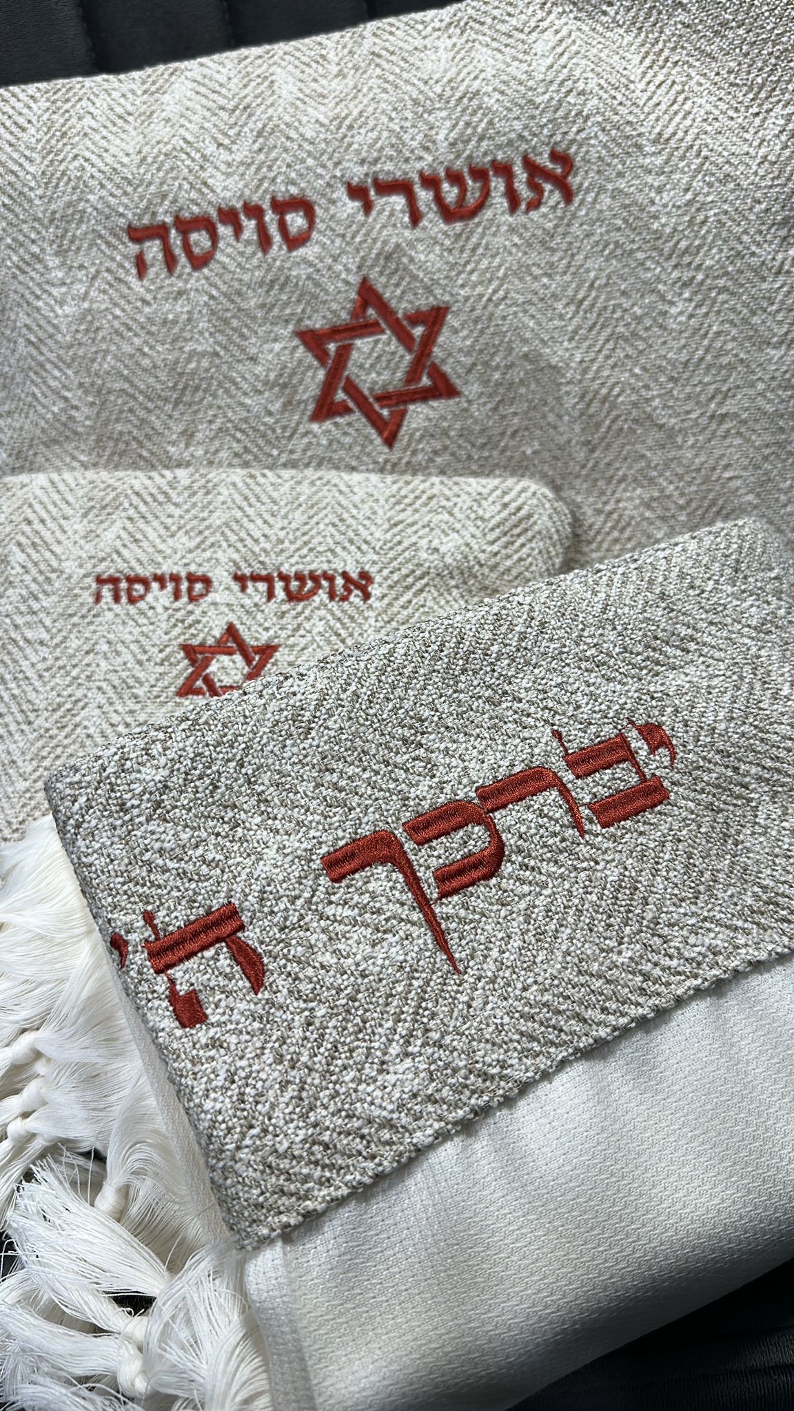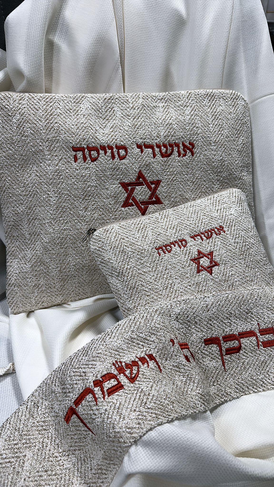 סט כיסויים וטלית מהודרת 100% צמר בעיצוב ייחודי שלנו, תוצרת הארץ