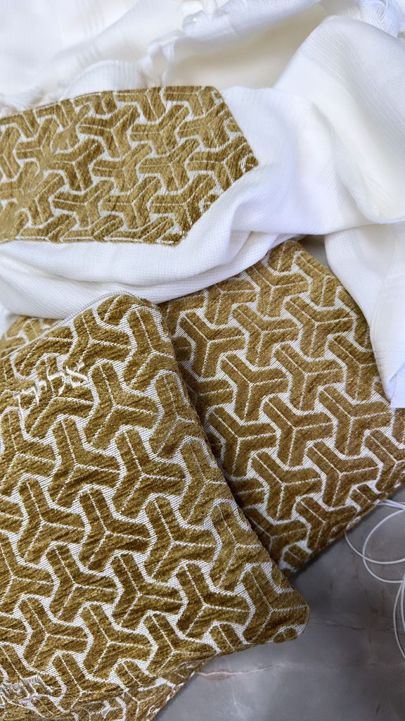 סט כיסויים בעיצוב ייחודי שלנו הכולל בטנה איכותית , תוצרת הארץ ניתן להוסיף שם בעברית / אנגלית לבחירת הלקוח למעבר לטלית התואמת לסט לחצו טלית Premium – דגם בית יוסף עם עטרה דגם Y צבע צהוב