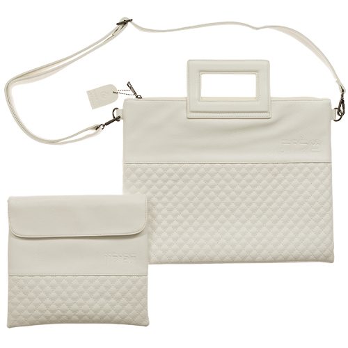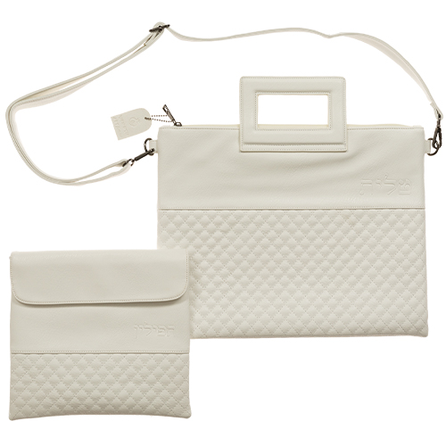 סט כיסויים עם ידיות ורצועת כתף דגם מעוינים טלית צבע לבן ניתן להוסיף שם בעברית / אנגלית לבחירת הלקוח
