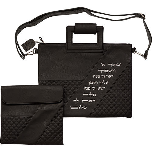 סט כיסויים עם ידיות ורצועת כתף דגם פס אלכסון יברכך, צבע שחור מתכת כסף ניתן להוסיף שם בעברית / אנגלית לבחירת הלקוח