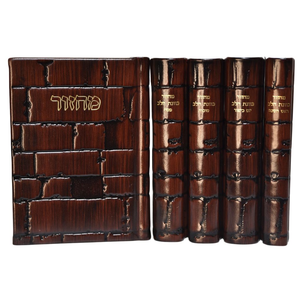 סט מחזורים מפואר עור אמיתי דגם כותל צבע חום הסט כולל 5 כרכים (ראש השנה, כיפור, סוכות, פסח, שבועות) ניתן להוסיף שם בעברית / אנגלית לבחירת הלקוח