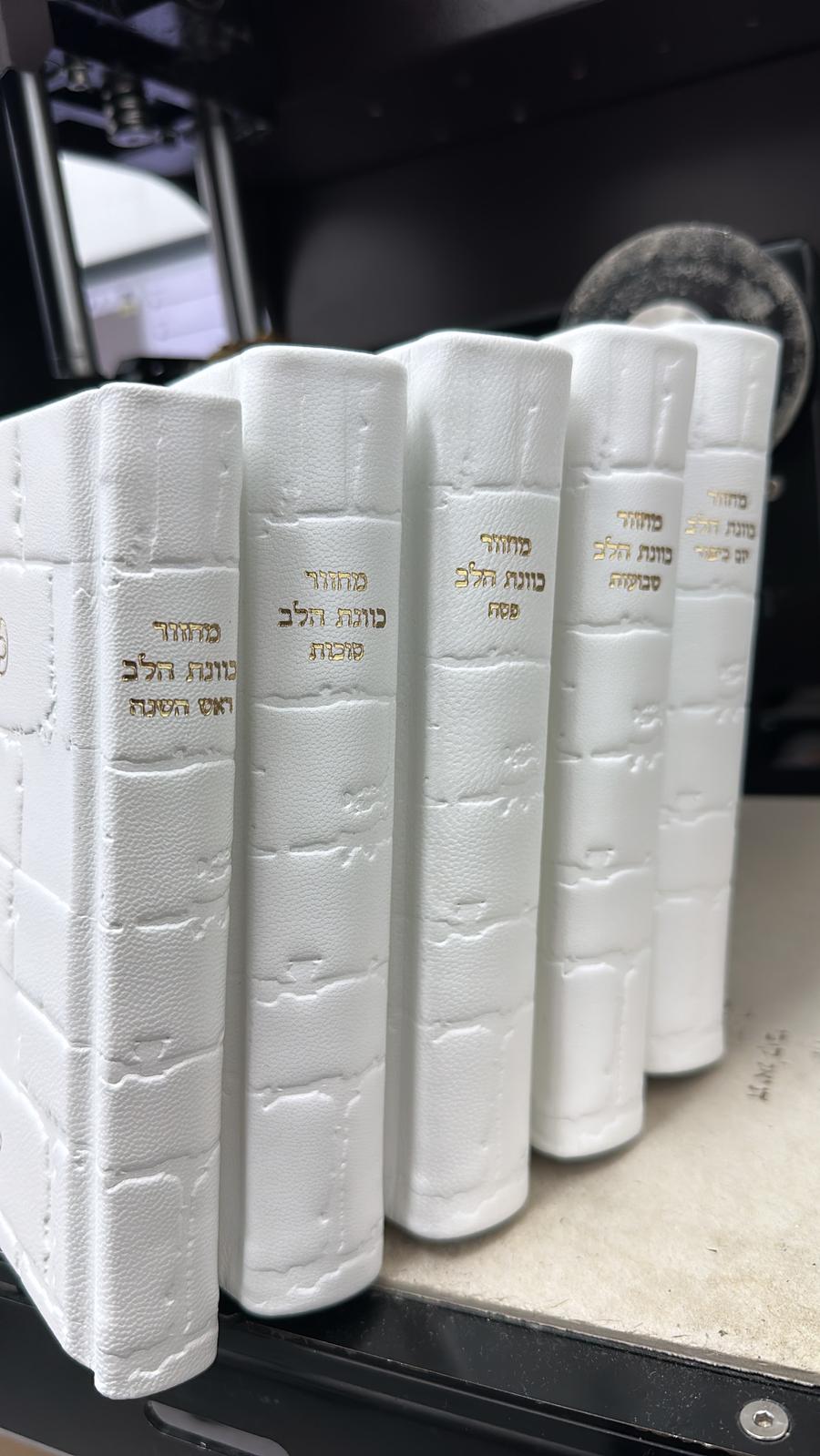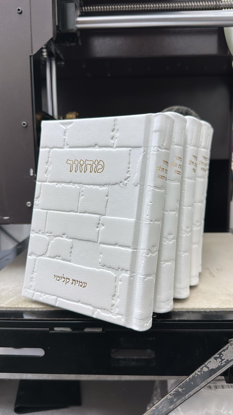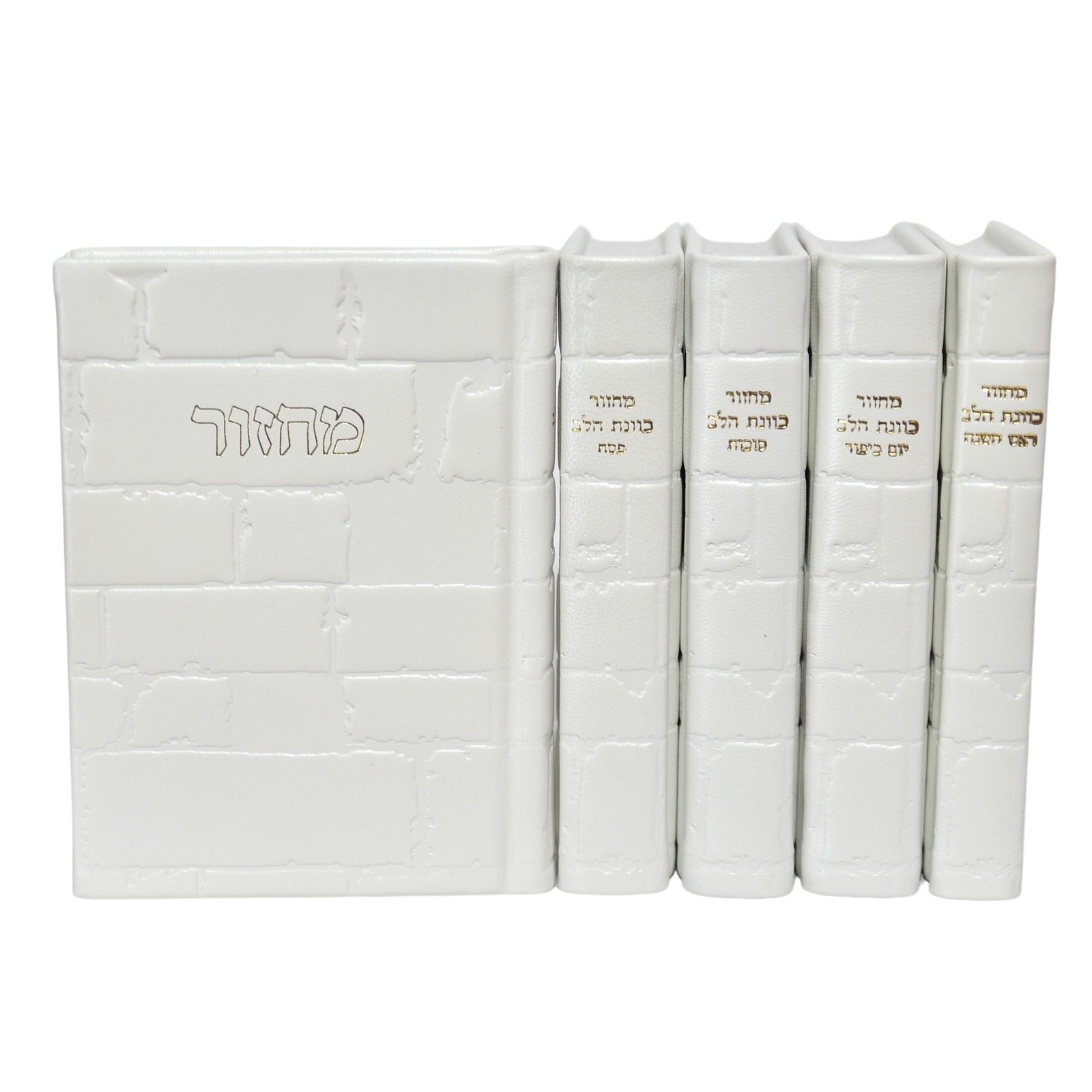 סט מחזורים מפואר עור אמיתי דגם כותל צבע לבן הסט כולל 5 כרכים (ראש השנה, כיפור, סוכות, פסח, שבועות) ניתן להוסיף שם בעברית / אנגלית לבחירת הלקוח