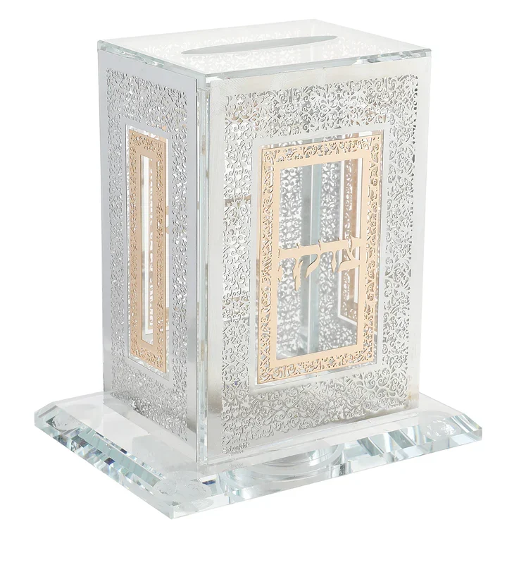 קופת צדקה זכוכית דגם עיטורי תחרה בצבע כסף משולב עם צבע זהב