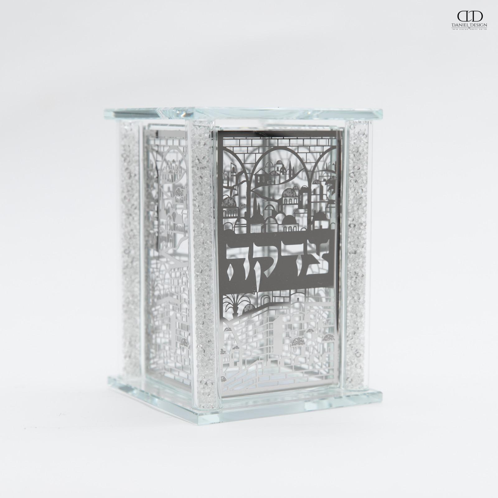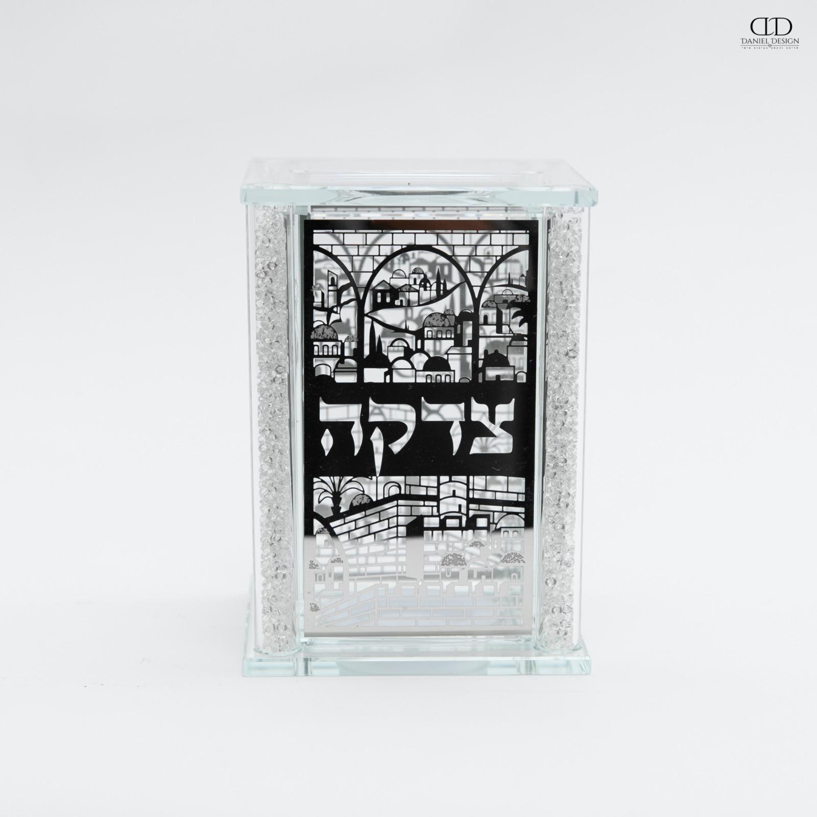 קופת צדקה מזכוכית בתוספת פלקטה בצבע כסף