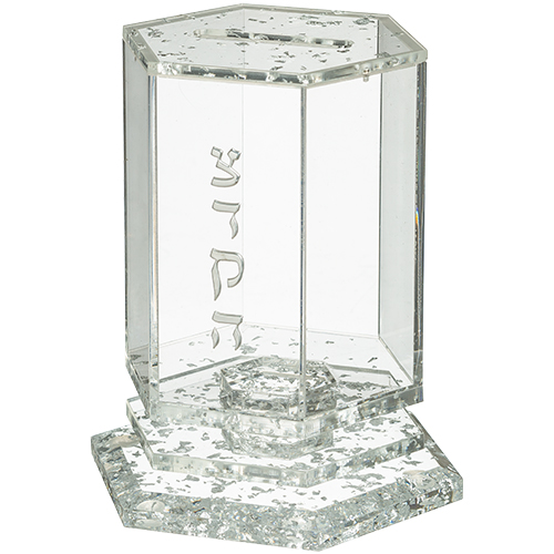 קופת צדקה פרספקט שקוף דגם משושה נצנץ אותיות בולטות צבע כסף