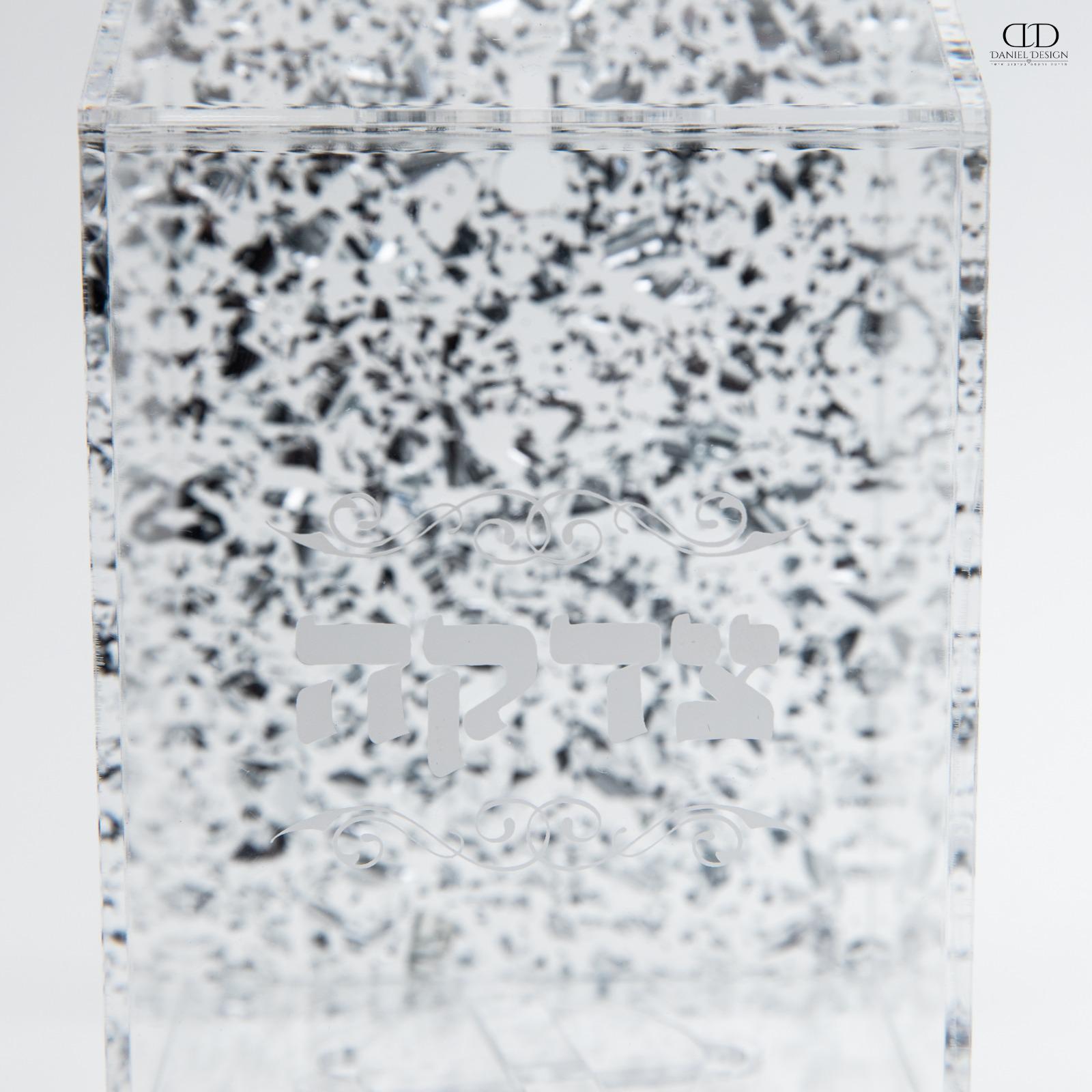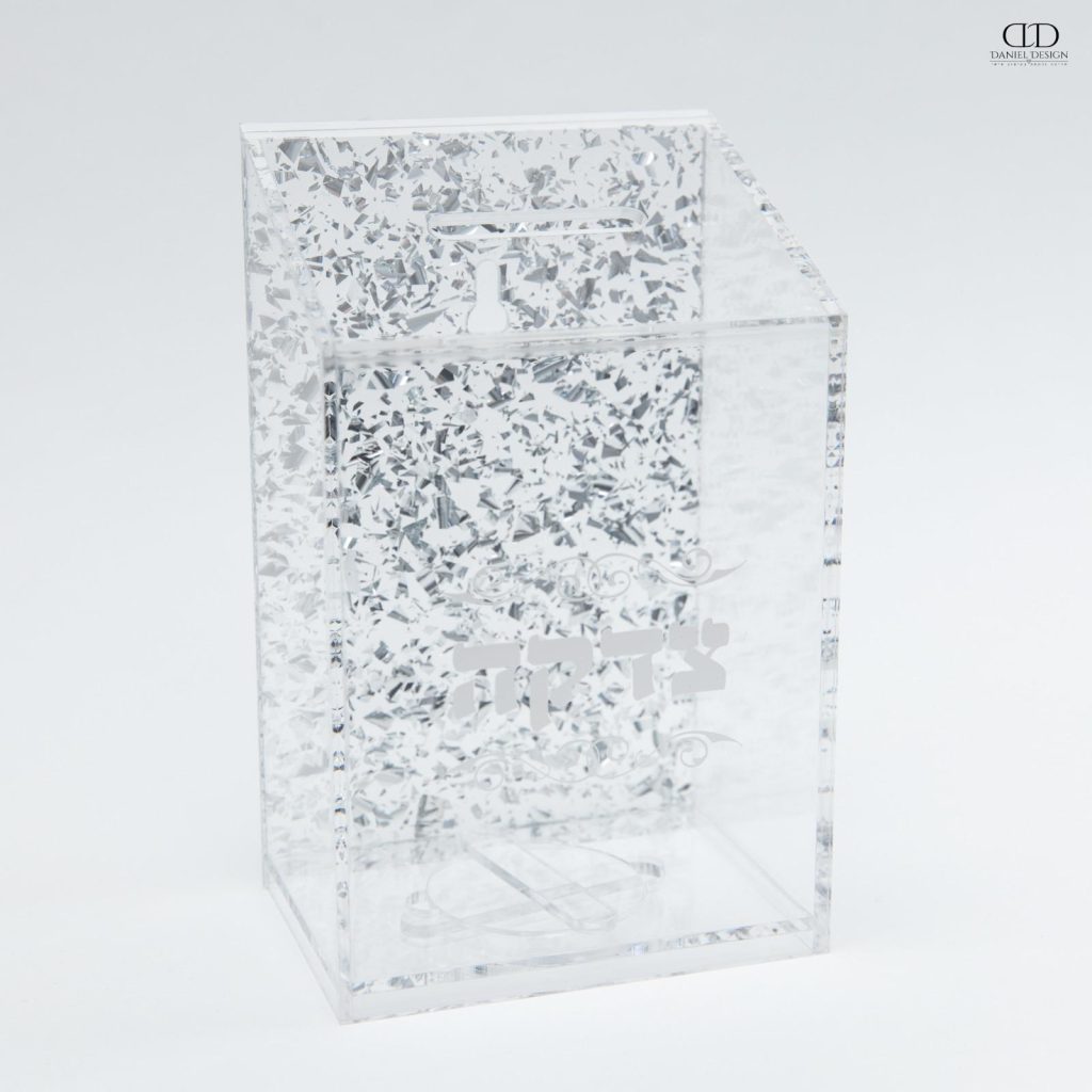 קופת צדקה מפרספקס שקוף עם נצנצים בצבע כסף