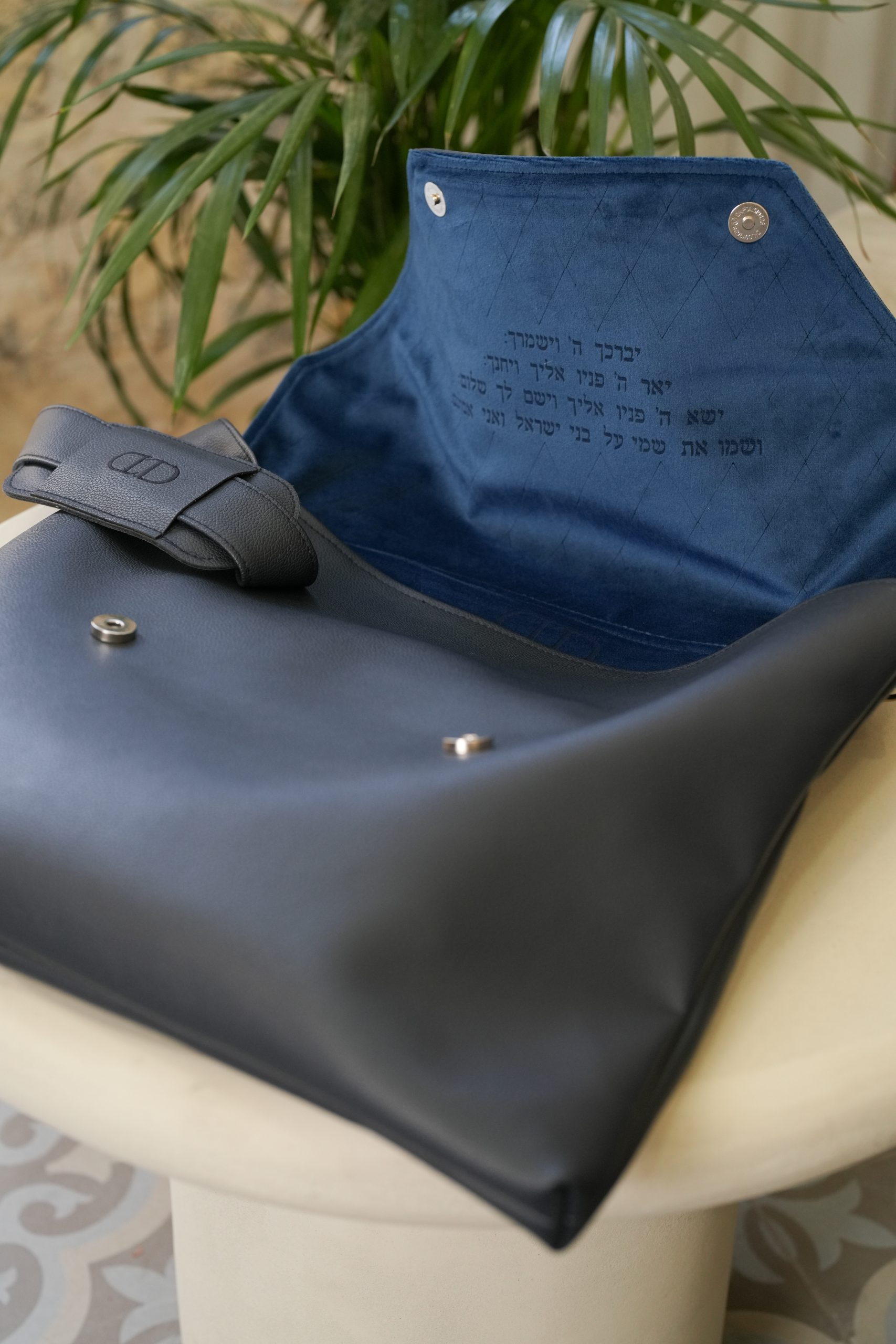 תיק קלפה יוקרתי הכולל קטיפה פנימית משובחת וסגירה מגנטית כולל תיק תפילין תואם ורצועת כתף הניתנת להסרה ניתן להוסיף שם בעברית/אנגלית לבחירת הלקוח